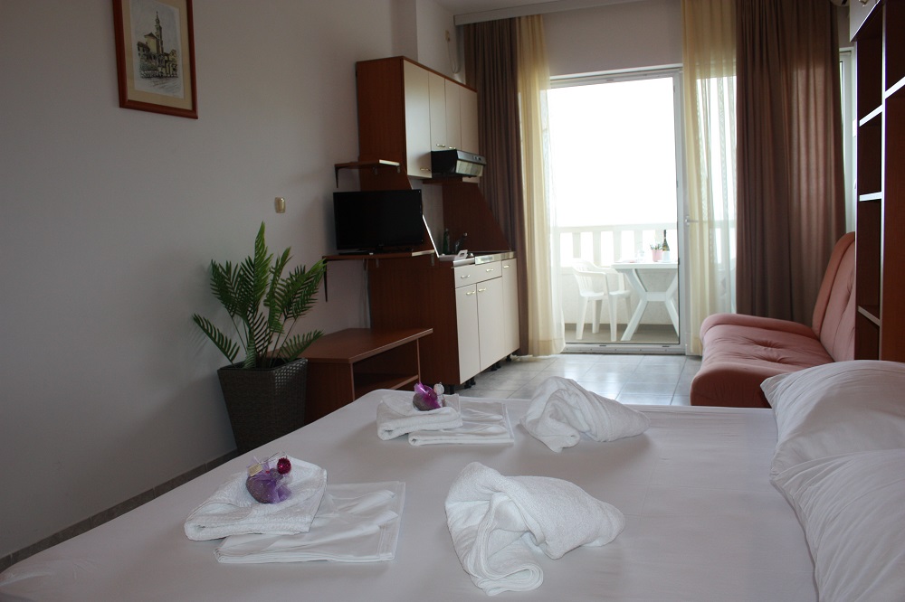 Студио 2+1 – соба со балкон со брачен кревет и помошно легло во чии склоп има кујна, WC, туш када, балкон, SAT-TV, WiFi